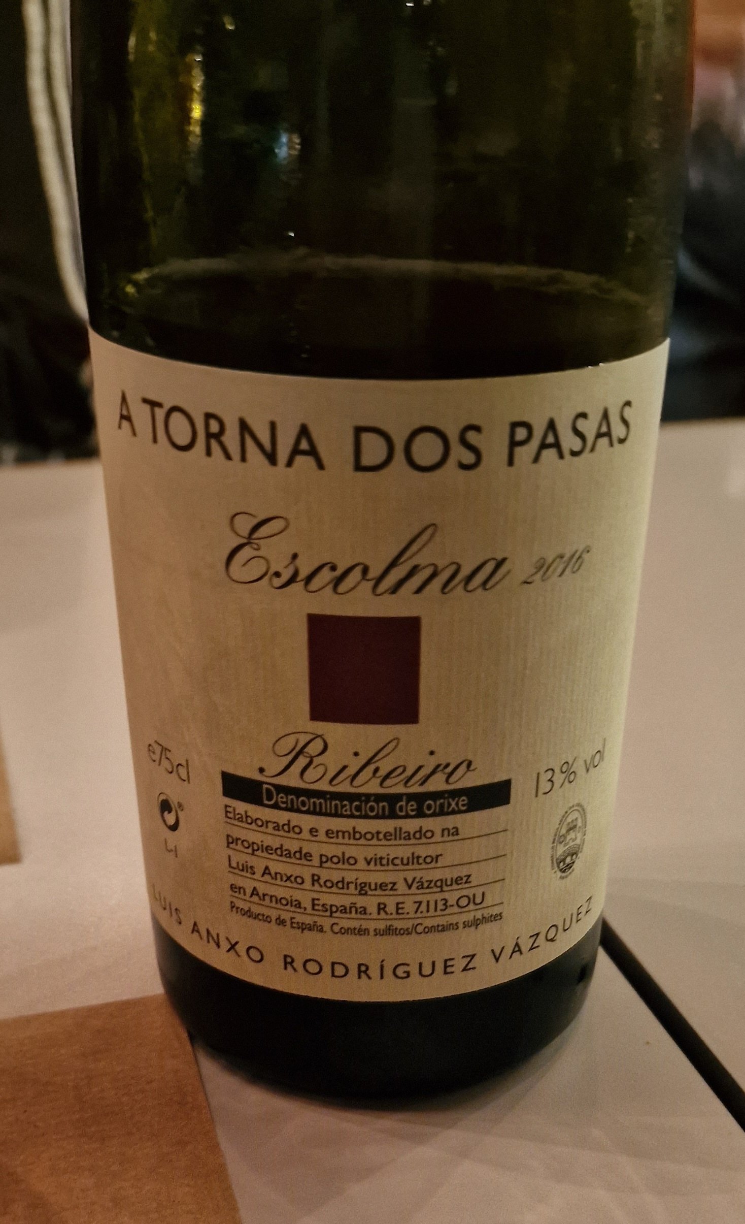 D.O. Ribeiro, Galicia – Brancellao, Ferrol, Caíño Longo y Caiño Redondo en empinadas laderas de granito en la localidad de Arnoia. Las uvas se despalillan y fermentan con sus levaduras autóctonas en depósito de inox. con una maceración de 3 semanas con 2 bazuqueos al día. Posteriormente se cría en barricas nuevas y seminuevas de roble francés durante 12 meses, sin clarificar ni filtrar. Permanece en botellero en bodega durante 3 años antes de su comercialización. A Torna dos Pasás Escolma 2016 es un tinto concentrado con mucha fruta roja y negra madura, violetas, aceituna negra, notas cárnicas y especiadas, alguna nota terrosa que nos hacen recordar a los vinos de Cornas en el Ródano. En boca tiene muy buena estructura y acidez, taninos pulidos y sedosos con recorrido y buena longitud. ribeiro