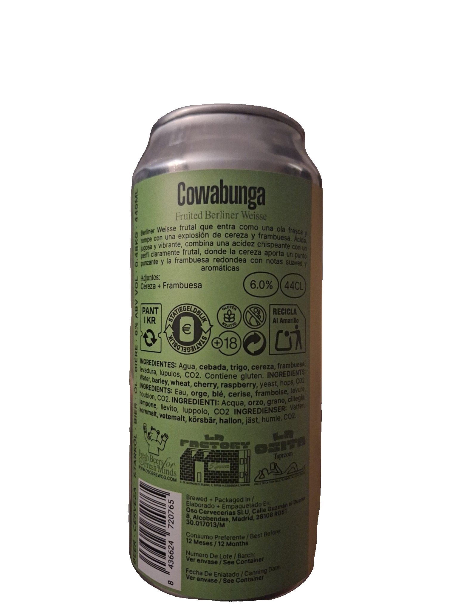 Cowabunga es una Fruited Berliner Weisse es una cerveza ácida, jugosa y muy refrescante que combina cereza y frambuesa. La cereza aporta un toque más punzante y ácido, mientras que la frambuesa redondea el conjunto con notas suaves y aromáticas. El resultado es una Berliner Weisse frutal, chispeante y fácil de beber, ideal para quienes buscan cervezas frescas, ácidas y afrutadas.